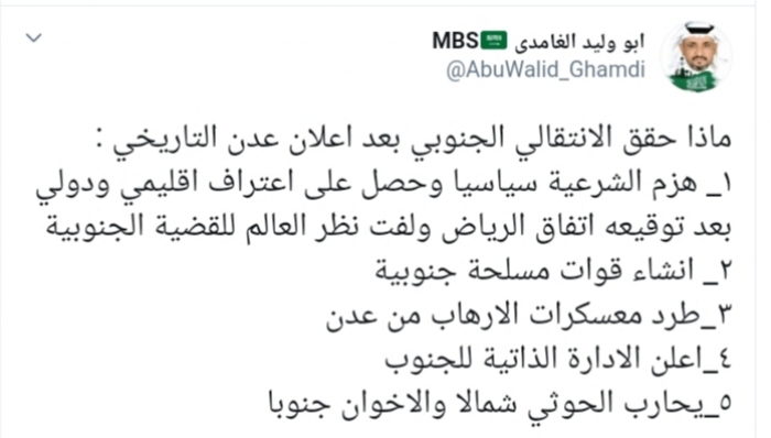 عدد الناشط السياسي السعودي أبو وليد الغامدي، اليوم الأحد، 5 إنجازات للمجلس الانتقالي الجنوبي بعد إعلان عدن التاريخي.