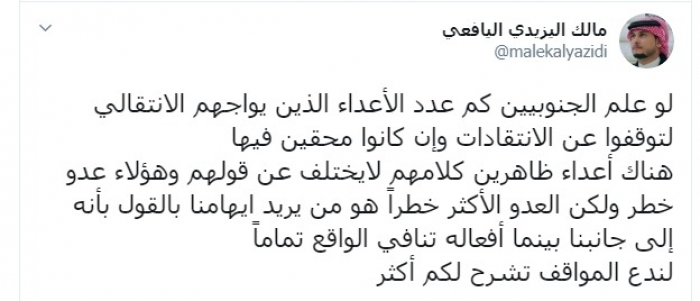 وكتب اليافعي عبر تغريدة له على "تويتر" رصدها " المشهد العربي":"لو علم الجنوبيين كم عدد الأعداء الذين يواجههم الانتقالي لتوقفوا عن الانتقادات وإن كانوا محقين فيها".