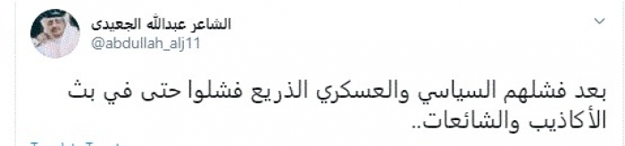 وقال في تغريدة عبر "تويتر" رصدها "المشهد العربي": "بعد فشلهم السياسي والعسكري الذريع فشلوا حتى في بث الأكاذيب والشائعات".