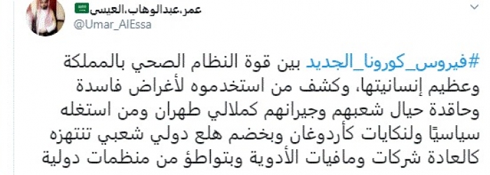 وقال في تغريدة عبر "تويتر" رصدها "المشهد العربي": "فيروس كورونا الجديد بين قوة النظام الصحي بالمملكة وعظيم إنسانيتها، وكشف من استخدموه لأغراض فاسدة وحاقدة حيال شعبهم وجيرانهم كملالي طهران ومن استغله سياسيًا ولنكايات كأردوغان وبخضم هلع دولي شعبي تنتهزه كالعادة شركات ومافيات الأدوية وبتواطؤ من منظمات دولية".