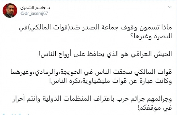 وقال في تغريدة عبر "تويتر" رصدها "المشهد العربي": "ماذا تسمون وقوف جماعة الصدر ضد (قوات المالكي) في البصرة وغيرها؟ الجيش العراقي هو الذي يحافظ على أرواح الناس".