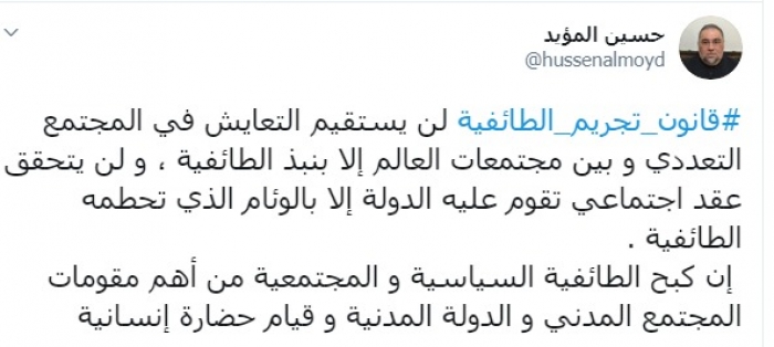 وكتب عبر تغريدة له على "تويتر" رصدها " المشهد العربي":" لن يستقيم التعايش في المجتمع التعددي و بين مجتمعات العالم إلا بنبذ الطائفية،و لن يتحقق عقد اجتماعي تقوم عليه الدولة إلا بالوئام الذي تحطمه الطائفية ".