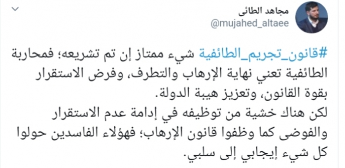 وكتب عبر تغريدة له على "تويتر" رصدها "المشهد العربي" :"قانون تجريم الطائفية شيء ممتاز إن تم تشريعه؛ فمحاربة الطائفية تعني نهاية الإرهاب والتطرف، وفرض الاستقرار بقوة القانون، وتعزيز هيبة الدولة".