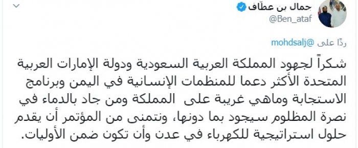 وكتب عبر تغريدة له على "تويتر" رصدها " المشهد العربي": "شكراً لجهود المملكة العربية السعودية ودولة الإمارات العربية المتحدة الأكثر دعما للمنظمات الإنسانية في اليمن وبرنامج الاستجابة وماهي غريبة على المملكة ومن جاد بالدماء في نصرة المظلوم سيجود بما دونها، ونتمنى من المؤتمر أن يقدم حلول استراتيجية للكهرباء في عدن وأن تكون ضمن الأوليات".
