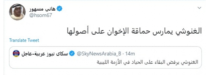 وقال في تغريدة عبر "تويتر" رصدها "المشهد العربي": "الغنوشي يمارس حماقة الإخوان على أصولها".