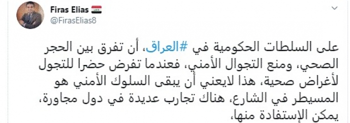 طالب الباحث السياسي العراقي فراس إلياس، اليوم، الحكومة العراقية بالتفرقة بين الحجر الصحي وحظر التجوال.