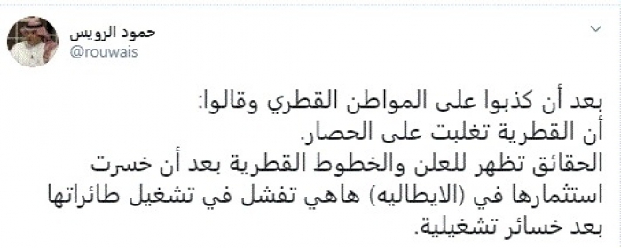 وقال في تغريدة عبر "تويتر" رصدها "المشهد العربي": "بعد أن كذبوا على المواطن القطري وقالوا: أن القطرية تغلبت على الحصار. الحقائق تظهر للعلن والخطوط القطرية بعد أن خسرت استثمارها في (الإيطالية) ها هي تفشل في تشغيل طائراتها بعد خسائر تشغيلية".