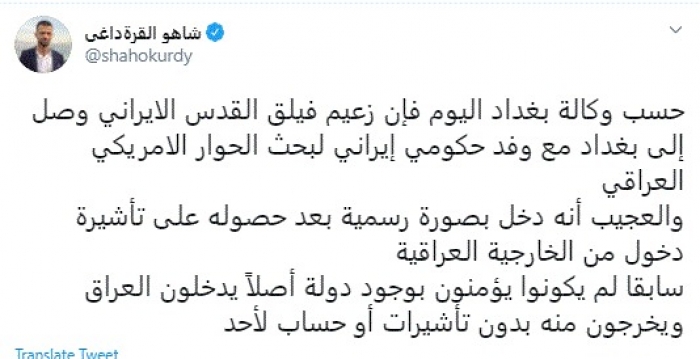 وقال في تغريدة عبر "تويتر" رصدها "المشهد العربي": "حسب وكالة بغداد اليوم فإن زعيم فيلق القدس الإيراني وصل إلى بغداد مع وفد حكومي إيراني لبحث الحوار الأمريكي العراقي".