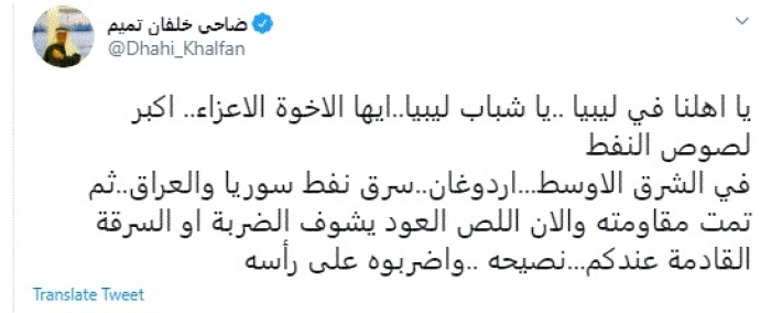 وقال في تغريدة عبر "تويتر" رصدها "المشهد العربي": "يا أهلنا في ليبيا.. يا شباب ليبيا.. أيها الأخوة الأعزاء.. أكبر لصوص النفط في الشرق الأوسط.. أردوغان.. سرق نفط سوريا والعراق.. ثم تمت مقاومته".