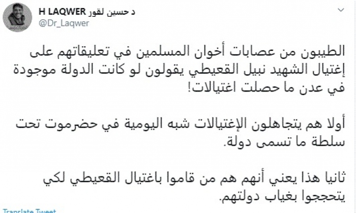 وقال في تغريدة عبر "تويتر" رصدها "المشهد العربي": "الطيبون من عصابات إخوان المسلمين في تعليقاتهم على اغتيال الشهيد نبيل القعيطي يقولون لو كانت الدولة موجودة في عدن ما حصلت اغتيالات".