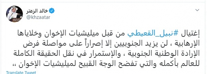 وكتب في تغريدة عبر "تويتر" رصدها "المشهد العربي": "اغتيال نبيل القعيطي من قبل مليشيات الإخوان وخلاياها الإرهابية، لن يزيد الجنوبيين إلا إصراراً على مواصلة فرض الإرادة الوطنية الجنوبية".