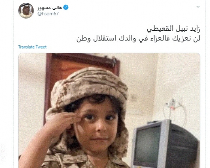 وقال في تغريدة عبر "تويتر" رصدها "المشهد العربي": "زايد نبيل القعيطي لن نعزيك فالعزاء في والدك استقلال وطن".