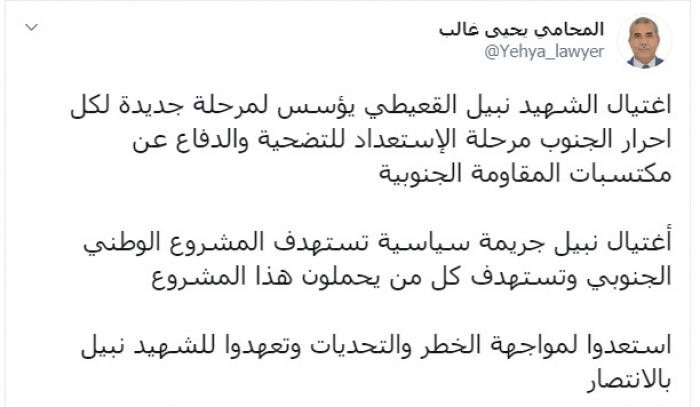 وكتب عبر تغريدة له على "تويتر" رصدها " المشهد العربي": "اغتيال الشهيد نبيل القعيطي يؤسس لمرحلة جديدة لكل أحرار الجنوب مرحلة الاستعداد للتضحية والدفاع عن مكتسبات المقاومة الجنوبية".