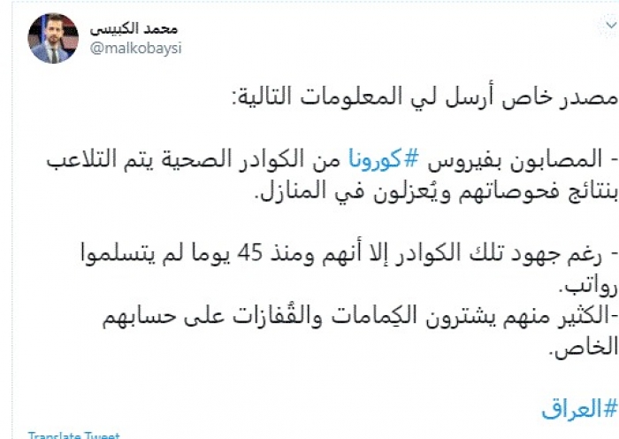 وقال في تغريدة عبر "تويتر" رصدها "المشهد العربي": "مصدر خاص أرسل لي المعلومات التالية: المصابون بفيروس كورونا من الكوادر الصحية يتم التلاعب بنتائج فحوصاتهم ويُعزلون في المنازل".