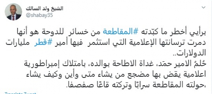 وكتب في تغريدة عبر "تويتر" رصدها "المشهد العربي": "برأيي أخطر ما كبّدته المقاطعة من خسائر للدوحة هو أنها دمرت ترسانتها الإعلامية التي استثمر فيها أمير قطر مليارات الدولارات".