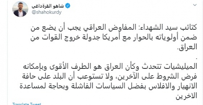 وقال في تغريدة عبر "تويتر" رصدها "المشهد العربي": "كتائب سيد الشهداء: المفاوض العراقي يجب أن يضع من ضمن أولوياته بالحوار مع أمريكا جدولة خروج القوات من العراق".