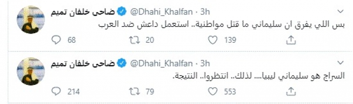 وقال في تغريدة عبر "تويتر" رصدها "المشهد العربي": "السراج هو سليماني ليبيا.. لذلك انتظروا النتيجة".