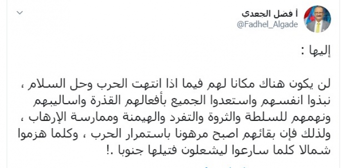 وكتب عبر تغريدة له على "تويتر" رصدها " المشهد العربي":"لن يكون هناك مكان لهم فيما إذا انتهت الحرب وحل السلام، نبذوا أنفسهم واستعدوا الجميع بأفعالهم القذرة وأساليبهم ونهمهم للسلطة والثروة والتفرد والهيمنة وممارسة الإرهاب ، ولذلك فإن بقاءهم أصبح مرهونا باستمرار الحرب، وكلما هزموا شمالا كلما سارعوا ليشعلوا فتيلها جنوبا".