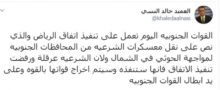 وكتب عبر تغريدة له على "تويتر" رصدها " المشهد العربي":"القوات الجنوبية اليوم تعمل على تنفيذ اتفاق الرياض والذي نص على نقل معسكرات الشرعية من المحافظات الجنوبية لمواجهة الحوثي في الشمال ولأن الشرعية عرقلت ورفضت تنفيذ الاتفاق فإنها ستنفذه وسيتم إخراج قواتها بالقوة وعلى يد أبطال القوات الجنوبية".