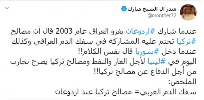 وكتب عبر تغريدة له على "تويتر" رصدها " المشهد العربي": "عندما شارك أردوغان بغزو العراق عام 2003 قال أن مصالح تركيا تحتم عليه المشاركة في سفك الدم العراقي وكذلك عندما دخل سوريا قال نفس الكلام".