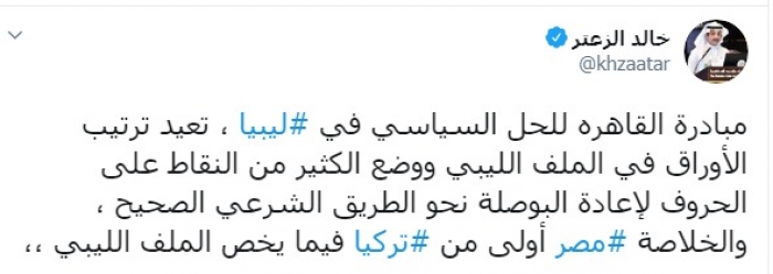 وكتب عبر تغريدة له على "تويتر" رصدها " المشهد العربي": "مبادرة القاهرة للحل السياسي في ليبيا ، تعيد ترتيب الأوراق في الملف الليبي ووضع الكثير من النقاط على الحروف لإعادة البوصلة نحو الطريق الشرعي الصحيح ".