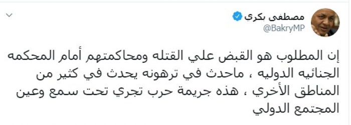 طالب البرلماني والإعلامي المصري، مصطفى بكري، اليوم الأحد، بمحاكمة أردوغان كمجرم حرب على جرائمه في ترهونة الليبية.