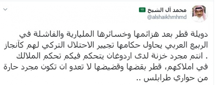 وكتب عبر تغريدة له على "تويتر" رصدها " المشهد العربي": "دويلة قطر بعد هزائمها وخسائرها المليارية والفاشلة في الربيع العربي يحاول حكامها تجيير الاحتلال التركي لهم كآنجاز".