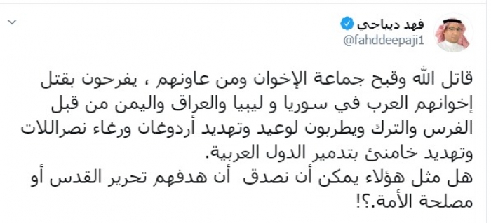 وكتب عبر تغريدة له على "تويتر" رصدها " المشهد العربي":" قاتل الله وقبح جماعة الإخوان ومن عاونهم ، يفرحون بقتل إخوانهم العرب في سوريا و ليبيا والعراق واليمن من قبل الفرس والترك ويطربون لوعيد وتهديد أردوغان ورغاء نصراللات وتهديد خامنئ بتدمير الدول العربية".