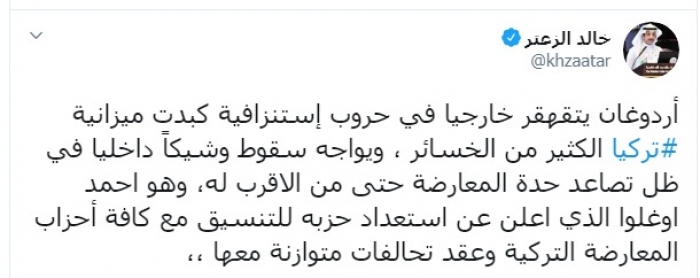 وكتب عبر تغريدة له على "تويتر" رصدها " المشهد العربي":"أردوغان يتقهقر خارجيا في حروب استنزافية كبدت ميزانية تركيا الكثير من الخسائر ، ويواجه سقوط وشيكاً داخليا في ظل تصاعد حدة المعارضة حتى من الأقرب له، وهو أحمد أوغلو الذي أعلن عن استعداد حزبه للتنسيق مع كافة أحزاب المعارضة التركية وعقد تحالفات متوازنة معها".