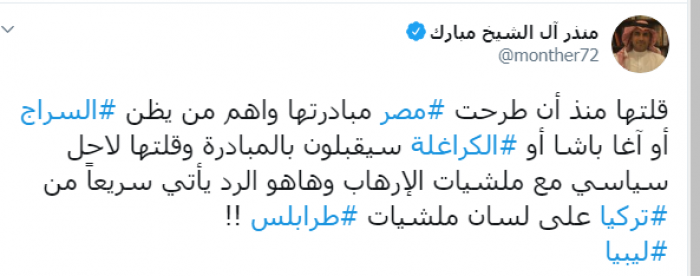 وكتب عبر تغريدة له على "تويتر" رصدها " المشهد العربي": "قلتها منذ أن طرحت مصر مبادرتها واهم من يظن أن السراج أو آغا باشا أو الكراغلة سيقبلون بالمبادرة وقلتها لا حل سياسي مع مليشيات الإرهاب وهاهو الرد يأتي سريعاً من تركيا على لسان مليشيات طرابلس".