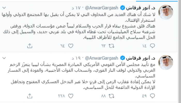 واختتم: "هناك قلق مشروع ببقاء قرار الحرب والسلام ليبياً ضمن مؤسسات الدولة، ورفض شرعنة سلاح الميليشيات تحت غطاء الدولة في بلد عربي جديد، والسبيل إلى ذلك الحل السياسي الجامع للأطراف الليبية".