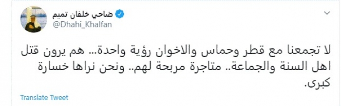 وقال في تغريدة عبر "تويتر" رصدها "المشهد العربي": "لا تجمعنا مع قطر وحماس والاخوان رؤية واحدة... هم يرون قتل اهل السنة والجماعة.. متاجرة مربحة لهم.. ونحن نراها خسارة كبرى".