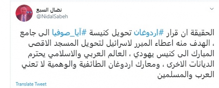 وكتب في تغريدة عبر "تويتر" رصدها "المشهد العربي": "الحقيقة أن قرار أردوغان تحويل كنيسة آيا صوفيا إلى جامع، الهدف منه إعطاء المبرر لإسرائيل لتحويل المسجد الأقصى المبارك إلى كنيس يهودي".
