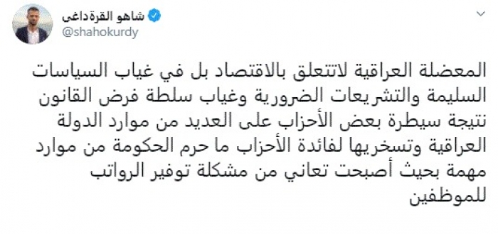 وكتب في تغريدة عبر "تويتر" رصدها "المشهد العربي": "المعضلة العراقية لاتتعلق بالاقتصاد بل في غياب السياسات السليمة والتشريعات الضرورية وغياب سلطة فرض القانون نتيجة سيطرة بعض الأحزاب على العديد من موارد الدولة العراقية وتسخريها لفائدة الأحزاب".