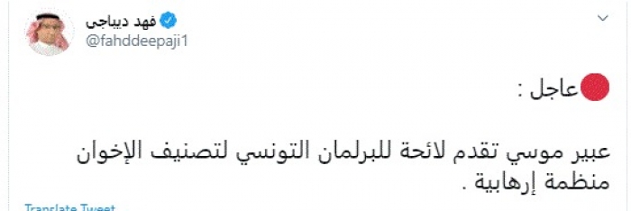 وقال في تغريدة عبر "تويتر" رصدها "المشهد العربي": "عبير موسي تقدم لائحة للبرلمان التونسي لتصنيف الإخوان منظمة إرهابية".
