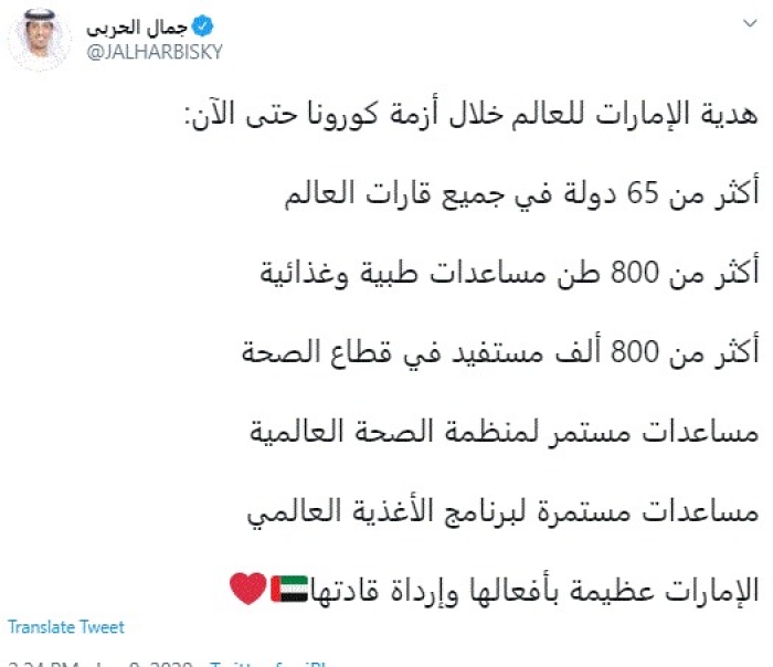 الحربي يكشف حجم هدايا الإمارات للعالم خلال أزمة كورونا