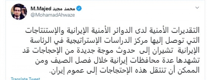 وقال في تغريدة عبر "تويتر" رصدها "المشهد العربي": "التقديرات الأمنية لدى الدوائر الأمنية الإيرانية والاستنتاجات التي توصل إليها مركز الدراسات الاستراتيجية في الرئاسة الإيرانية تشيران إلى حدوث موجة جديدة من الاحتجاجات قد تشهدها عدة محافظات إيرانية خلال فصل الصيف".