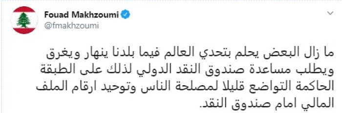 طالب السياسي اللبناني البارز فؤاد مخزومي، اليوم، النظام اللبناني بإنقاذ لبنان من الأزمة الاقتصادية.