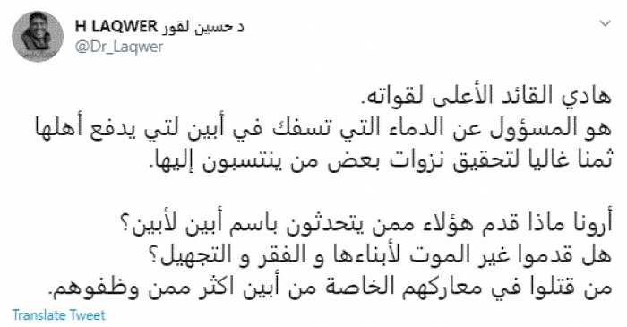وقال في تغريدة عبر "تويتر" رصدها "المشهد العربي": "هادي القائد الأعلى لقواته. هو المسؤول عن الدماء التي تسفك في أبين التي يدفع أهلها ثمنا غاليا لتحقيق نزوات بعض من ينتسبون إليها".