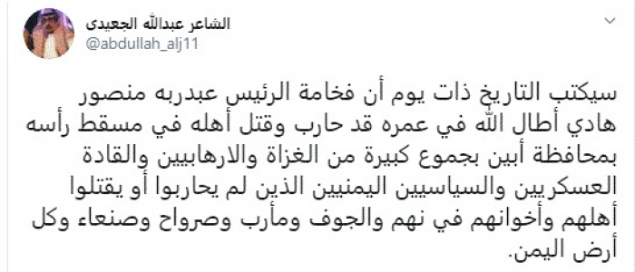 وكتب في تغريدة عبر "تويتر" رصدها "المشهد العربي": "سيكتب التاريخ ذات يوم أن فخامة الرئيس عبدربه منصور هادي أطال الله في عمره قد حارب وقتل أهله في مسقط رأسه بمحافظة أبين".