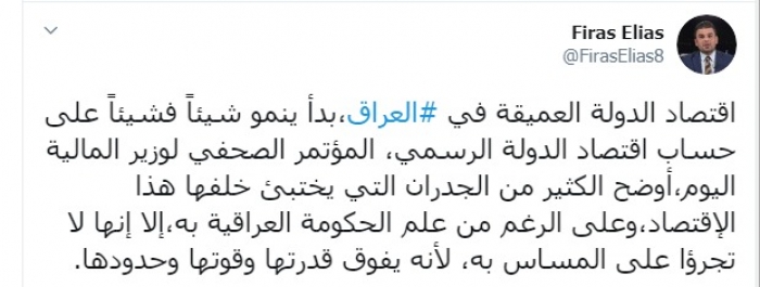 وكتب عبر تغريدة له على "تويتر" رصدها " المشهد العربي": "اقتصاد الدولة العميقة في العراق بدأ ينمو شيئاً فشيئاً على حساب اقتصاد الدولة الرسمي، المؤتمر الصحفي لوزير المالية اليوم أوضح الكثير من الجدران التي يختبئ خلفها هذا الاقتصاد ،وعلى الرغم من علم الحكومة العراقية به، إلا إنها لا تجرؤ على المساس به، لأنه يفوق قدرتها وقوتها وحدودها".