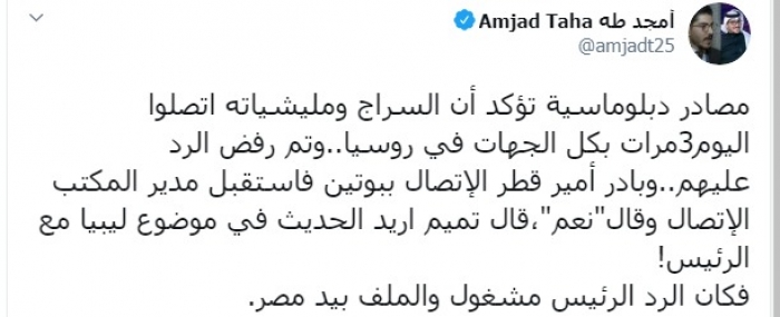 وكتب عبر تغريدة له على "تويتر" رصدها " المشهد العربي":"مصادر دبلوماسية تؤكد أن السراج ومليشياته اتصلوا اليوم 3 مرات بكل الجهات في روسيا، وتم رفض الرد عليهم".