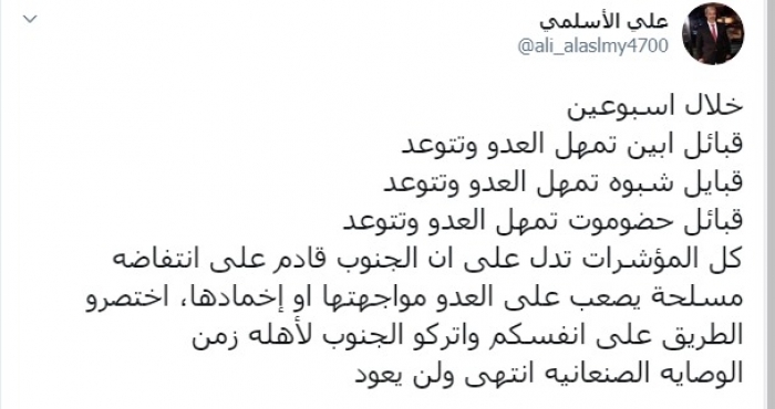 وكتب عبر تغريدة له على "تويتر" رصدها " المشهد العربي": "خلال أسبوعين، قبائل أبين تمهل العدو وتتوعد، قبائل شبوة تمهل العدو وتتوعد، قبائل حضرموت تمهل العدو وتتوعد".