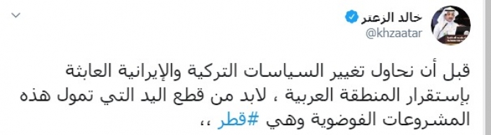 وكتب عبر تغريدة له على "تويتر" رصدها " المشهد العربي": "قبل أن نحاول تغيير السياسات التركية والإيرانية العابثة باستقرار المنطقة العربية، لابد من قطع اليد التي تمول هذه المشروعات الفوضوية وهي قطر".