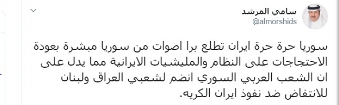 وكتب عبر تغريدة له على "تويتر" رصدها " المشهد العربي": "سوريا حرة حرة إيران تطلع برا، أصوات من سوريا مبشرة بعودة الاحتجاجات على النظام والمليشيات الإيرانية مما يدل على أن الشعب العربي السوري انضم لشعبي العراق ولبنان للانتفاض ضد نفوذ إيران الكريه".