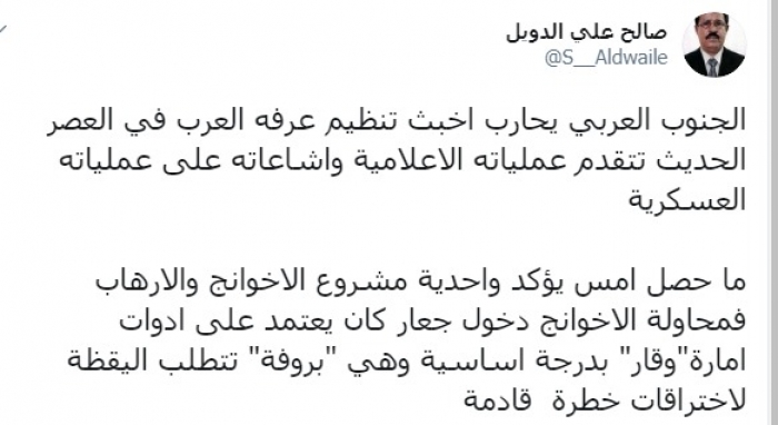 أكد الناشط السياسي صالح على الدويل، اليوم الإثنين، أن الجنوب يواجه أخبث تنظيم عرفه العرب في العصر الحديث وهو تنظيم الإخوان الإرهابي.