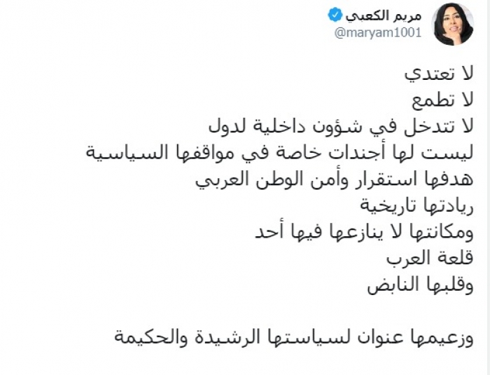 وكتبت عبر تغريدة له على "تويتر" رصدها " المشهد العربي": "لا تعتدي لا تطمع، لا تتدخل في شؤون داخلية لدول، ليست لها أجندات خاصة في مواقفها السياسية، هدفها استقرار وأمن الوطن العربي ".