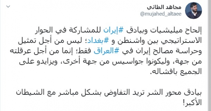 وكتب عبر تغريدة له على "تويتر" رصدها " المشهد العربي":"إلحاح ميليشيات وبيادق إيران للمشاركة في الحوار الاستراتيجي بين واشنطن و بغداد؛ ليس من أجل تمثيل وحراسة مصالح إيران في العراق فقط؛ إنما من أجل عرقلته من جهة، وليكونوا جواسيس من جهة أخرى، ويزايدوا على الجميع بإفشاله.