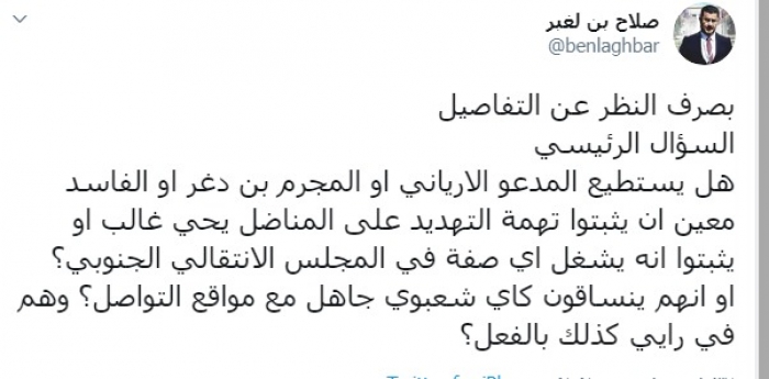 وكتب عبر تغريدة له على "تويتر" رصدها " المشهد العربي":"بصرف النظر عن التفاصيل، السؤال الرئيسي، هل يستطيع المدعو الإرياني أو المجرم بن دغر أو الفاسد معين أن يثبتوا تهمة التهديد على المناضل يحيي غالب أو يثبتوا أنه يشغل أي صفة في المجلس الانتقالي الجنوبي؟"