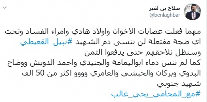 وكتب عبر تغريدة له على "تويتر" رصدها " المشهد العربي":"مهما فعلت عصابات الإخوان وأولاد هادي وأمراء الفساد وتحت أي ضجة مفتعلة لن ننسى دم الشهيد نبيل القعيطي وسنظل نلاحقهم حتى يدفعوا الثمن".